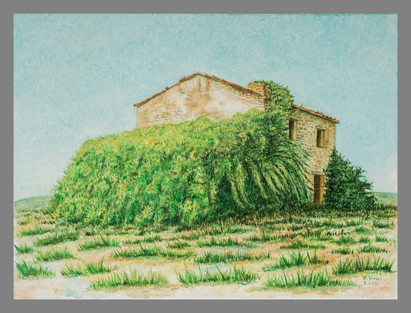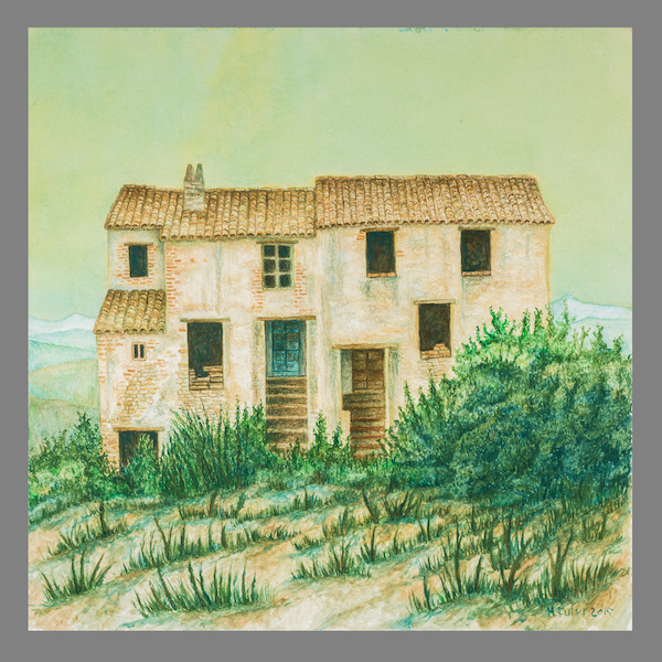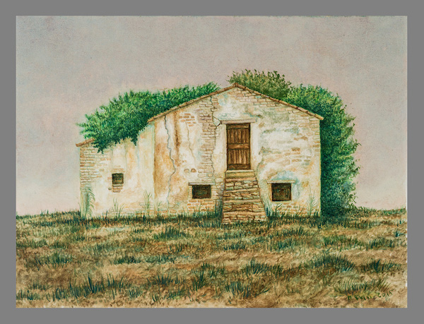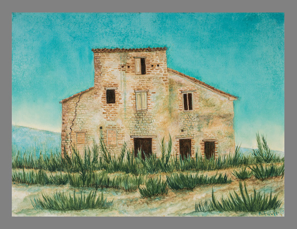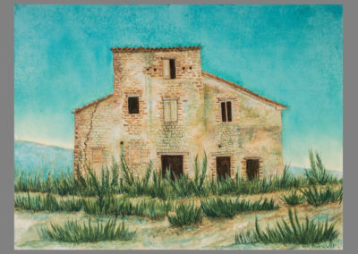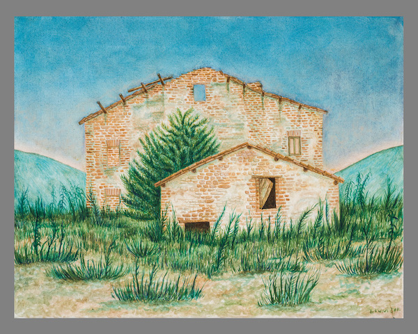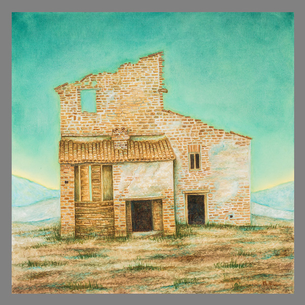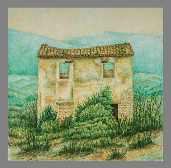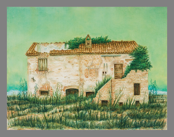 Queste case si stampano viventi – morenti contro il cielo in pieno sole, abitano un destino di silenzio e come di attesa. Nessuno osa toccare questo disegno di volti che si aprono insieme alle porte, alle finestre, per tratteggiare lentissimamente il volere, il fulgore di un fertile abbandono. In realtà esse sono i profili di un unico volto, ritagliato tra le spoglie della Natura, un volto che le accompagna e a volte premurosamente cancella le sagome dei vecchi muri per riempirle di effluvi, di silenzi vistosamente languenti, di cespugli che ingigantiscono quasi a proteggere quanto è rimasto di una vita intera senza cedere alla morte. Sono parvenze dí un passato, tratteggiate con la pittura ad olio minutamente, col sentimento dell’Artista che ha deciso di salvarne l’aspetto riproducendo uno, due, tanti volti che poi sono le vestigia di un volto solo, la cui bellezza sconfina in una grazia fertile e sommessa, un linguaggio ripescato e immortalato da uno stile pittorico volutamente gentile e quasi religioso. I colori delle superfici oscillano tra il marrone e il verde con un equilibrio e un fare meditativo che ci invita a trattenere lo sguardo al loro procedere infinitesimo e paradossalmente eloquente, ad un discorso che ci chiama ad assumere nella memoria degl improvvisi silenzi.