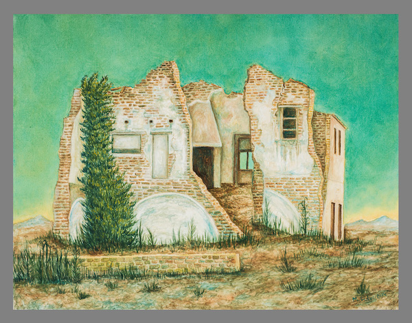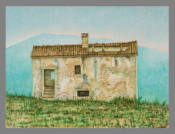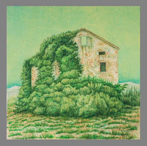 Case in rovina come fantasmi in cui l’avanzare del Tempo ha depositato le sue orme, i segni della vita che continua nei muri sconnessi, sotto cieli azzurrini o decisamente verdi, case antiche dove ad abitare è rimasta l’erba, sottile o folta come una capigliatura che s’insinua nel disegno dei muri quasi a tenerli stretti in un unico respiro.